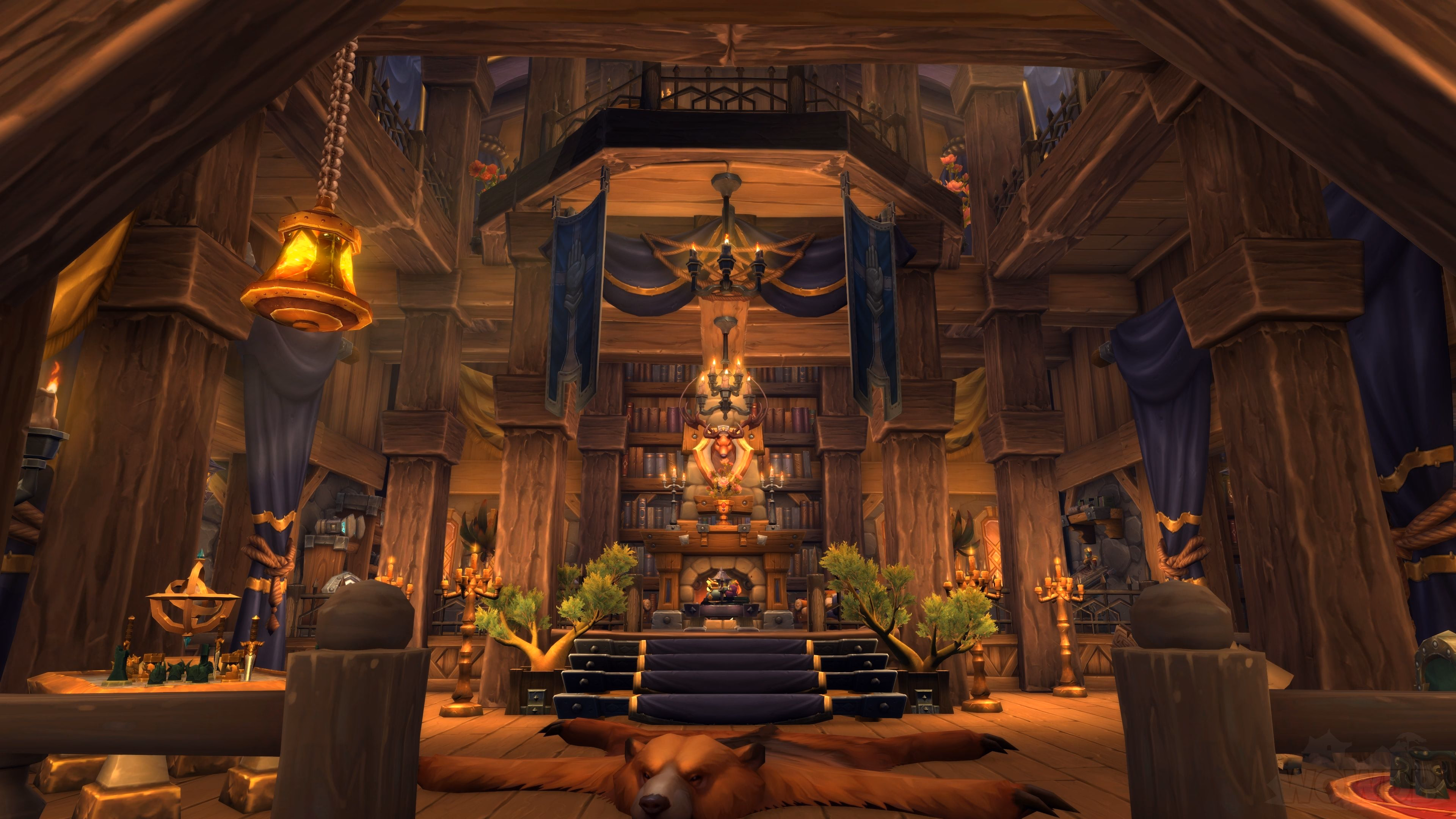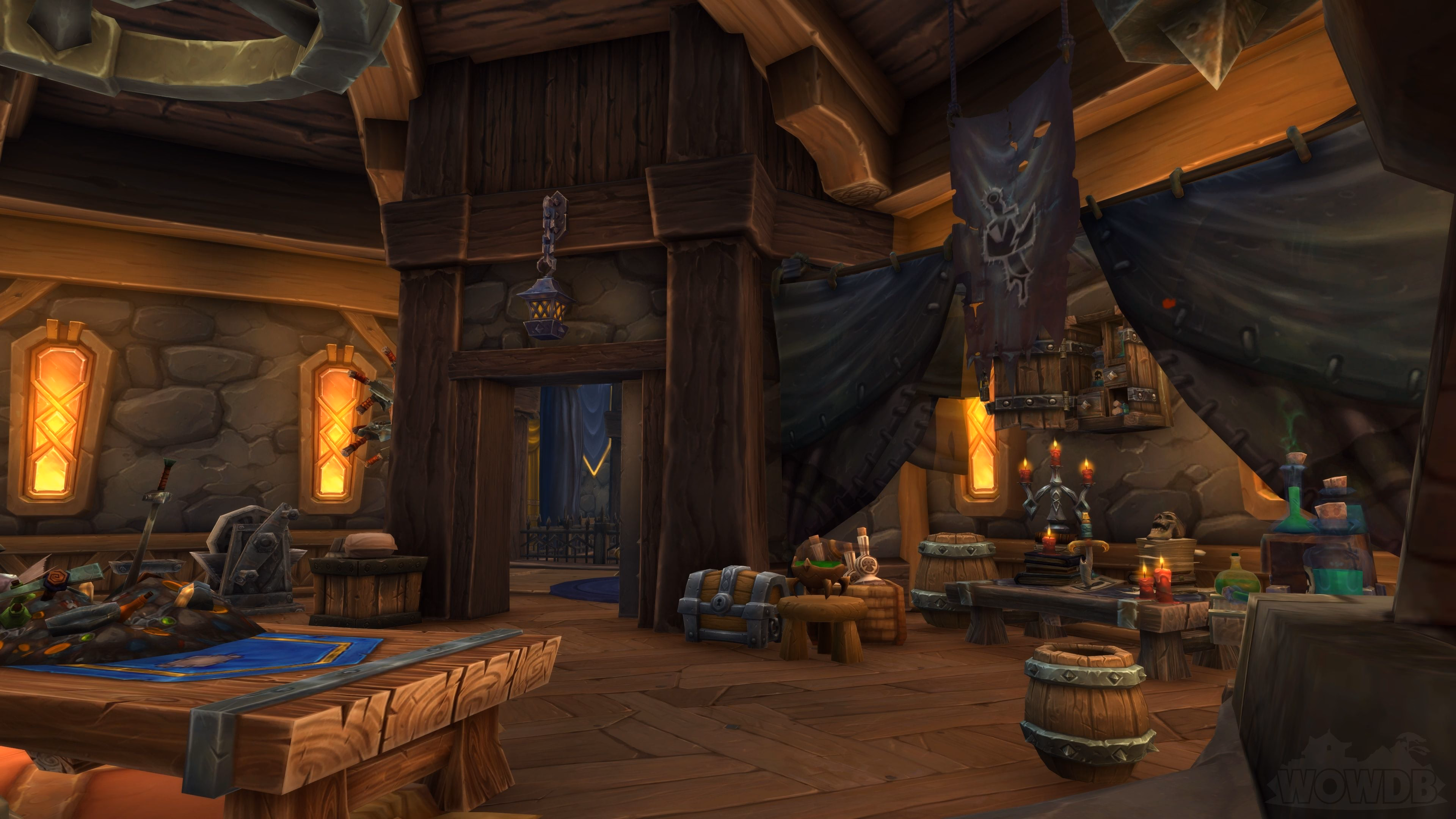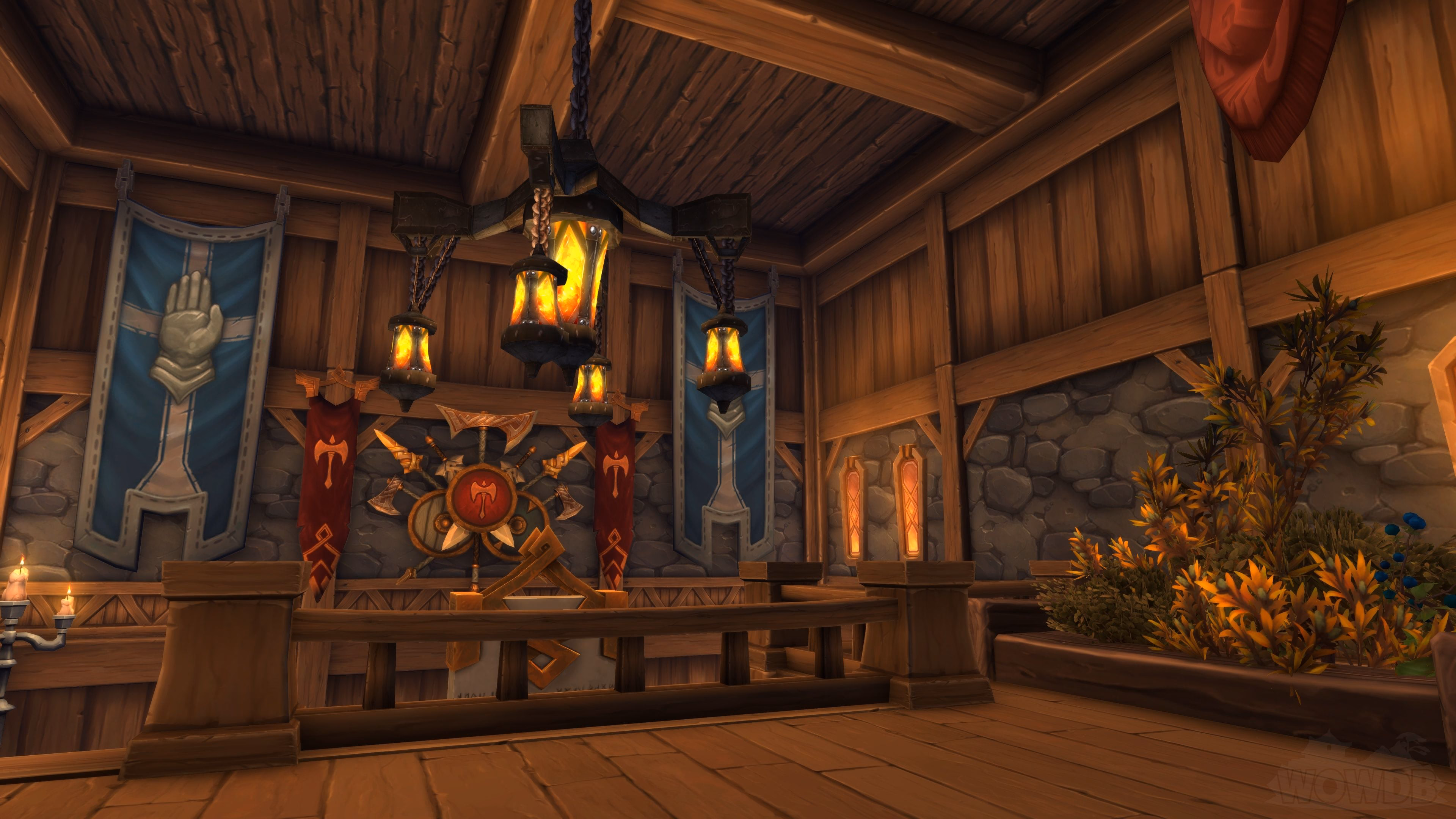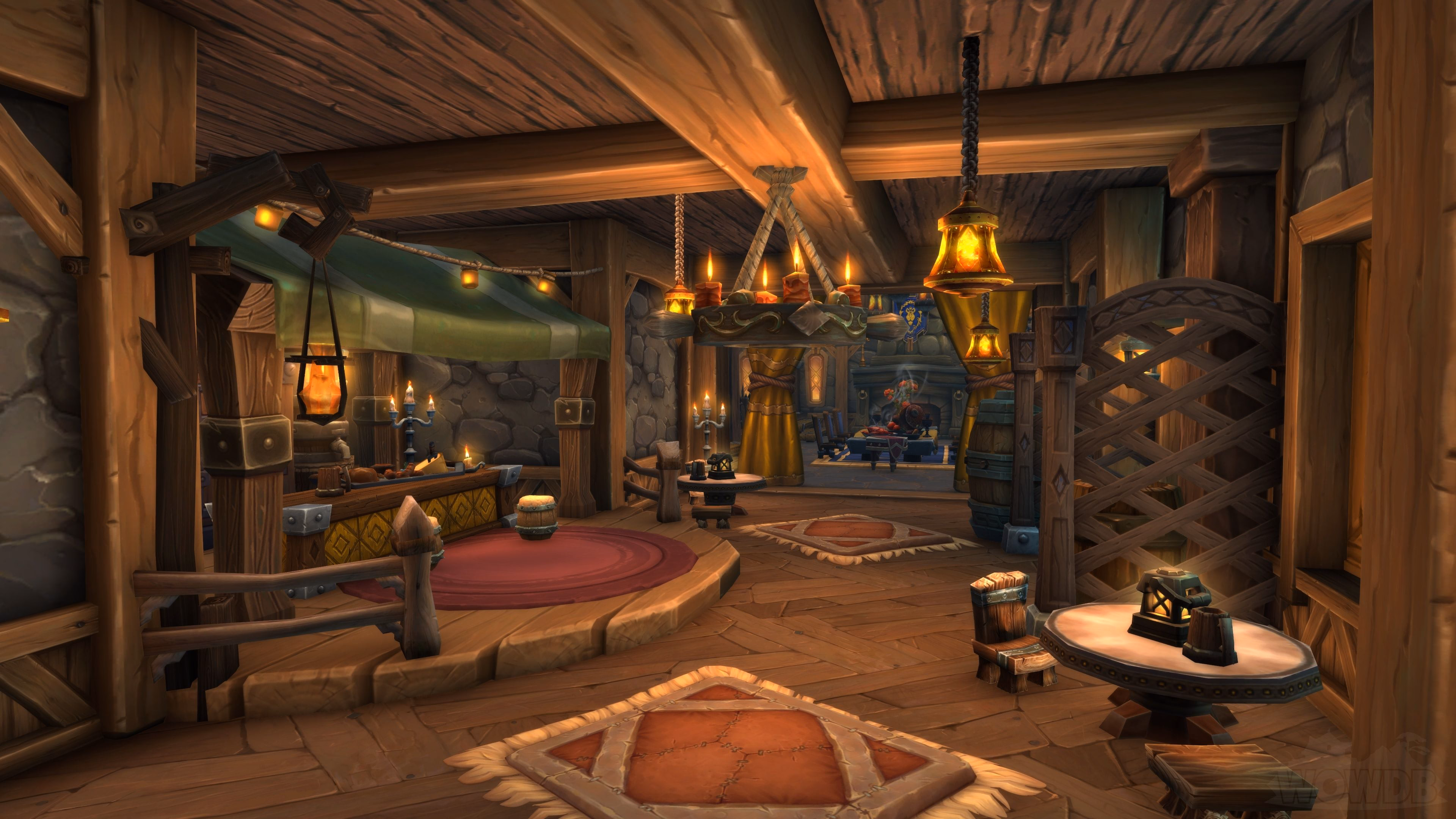 The interior adopts a gigantic architecture adorned with the memories of the paladin who has faced the dangers of Azeroth for fifteen years. The ground floor includes the reception rooms: hall with memorial, large living room, bar, dining room, library, chapel and winter garden. The staircase opens onto the cellar. Upstairs, the private area, the workshop and the bedroom. The adjoining bathroom is currently being designed: it will be a rocky hot spring. The upper floor has numerous balconies allowing the paladin to follow the various events and discussions on the ground floor in complete discretion.