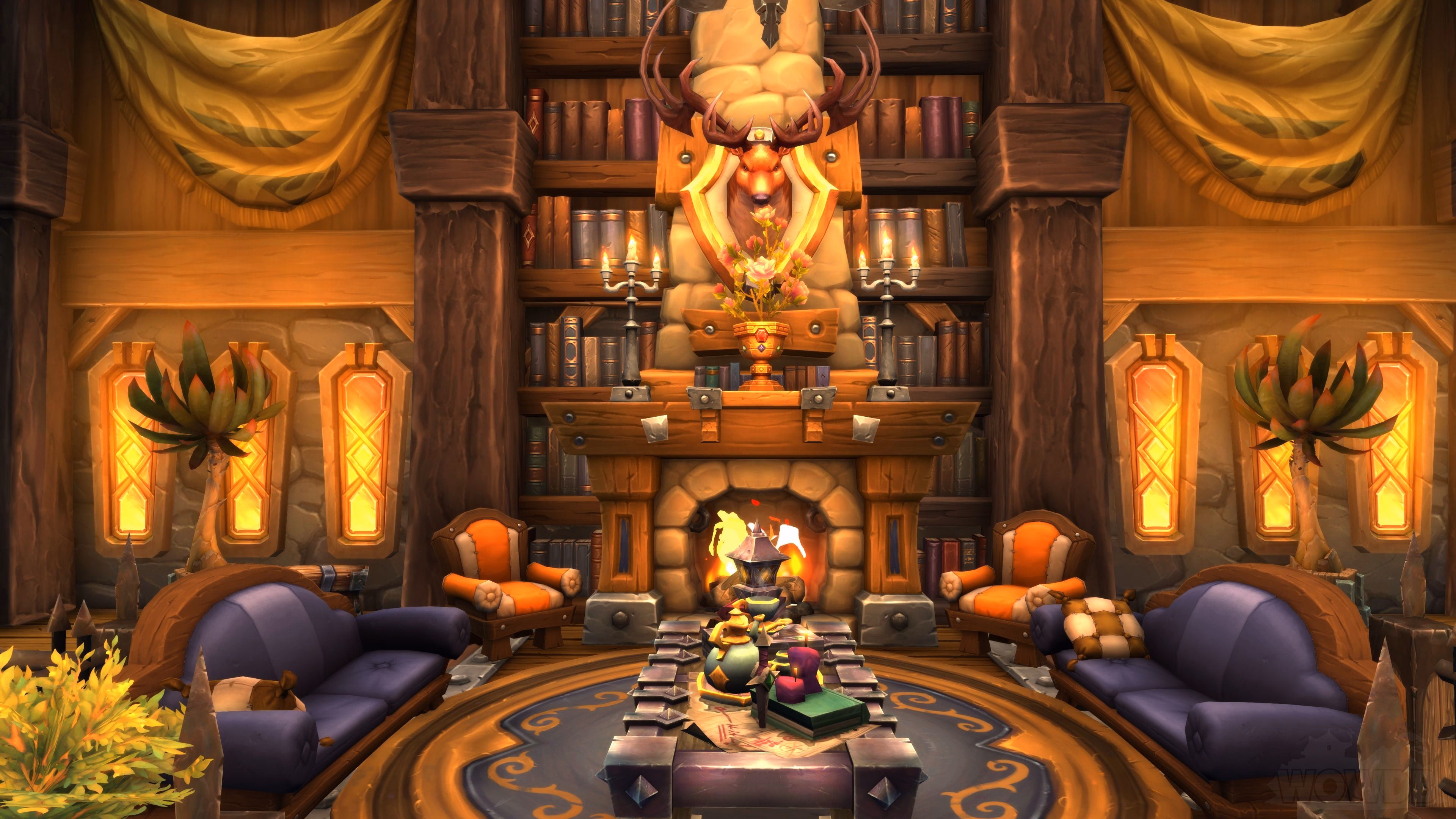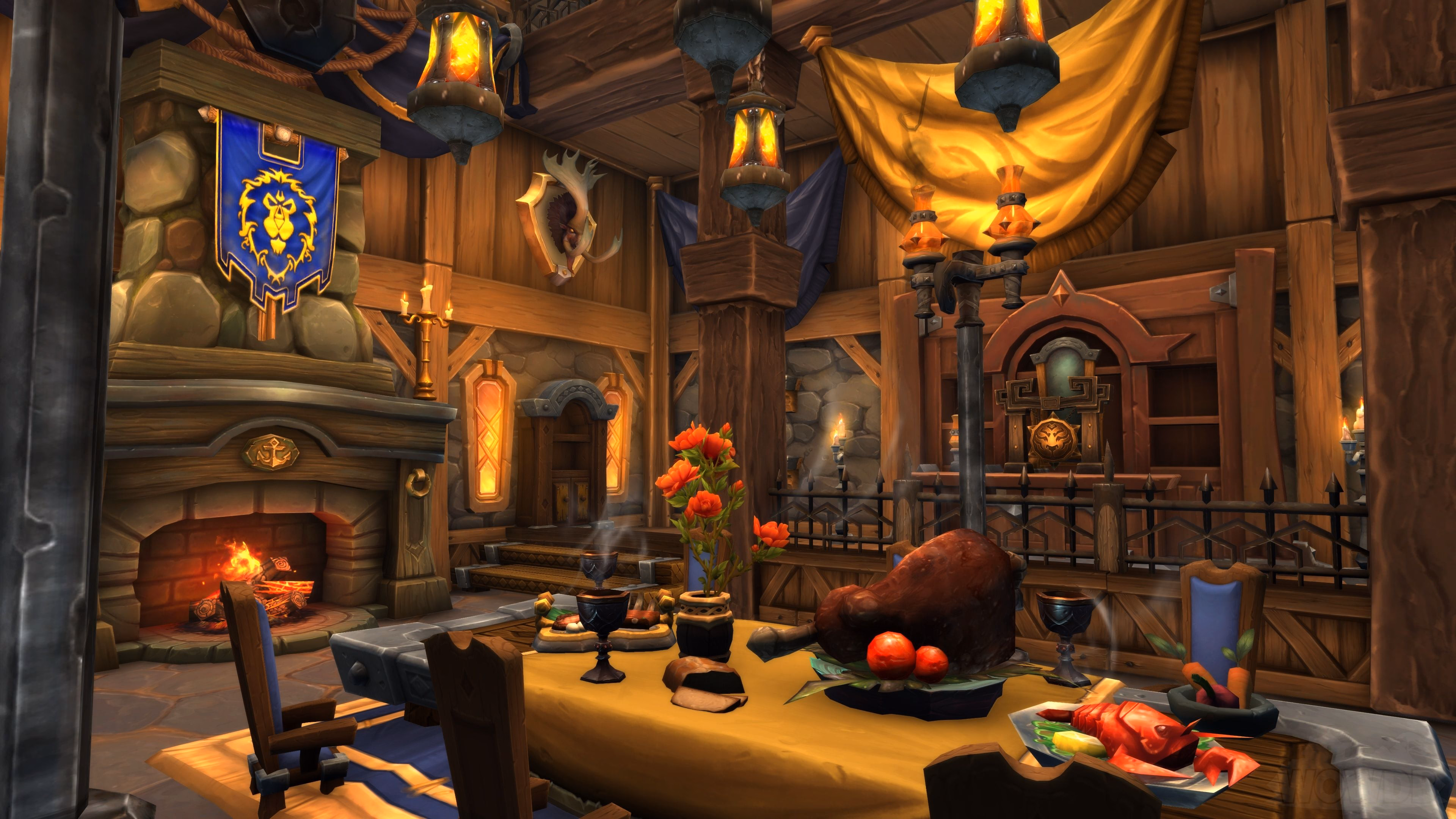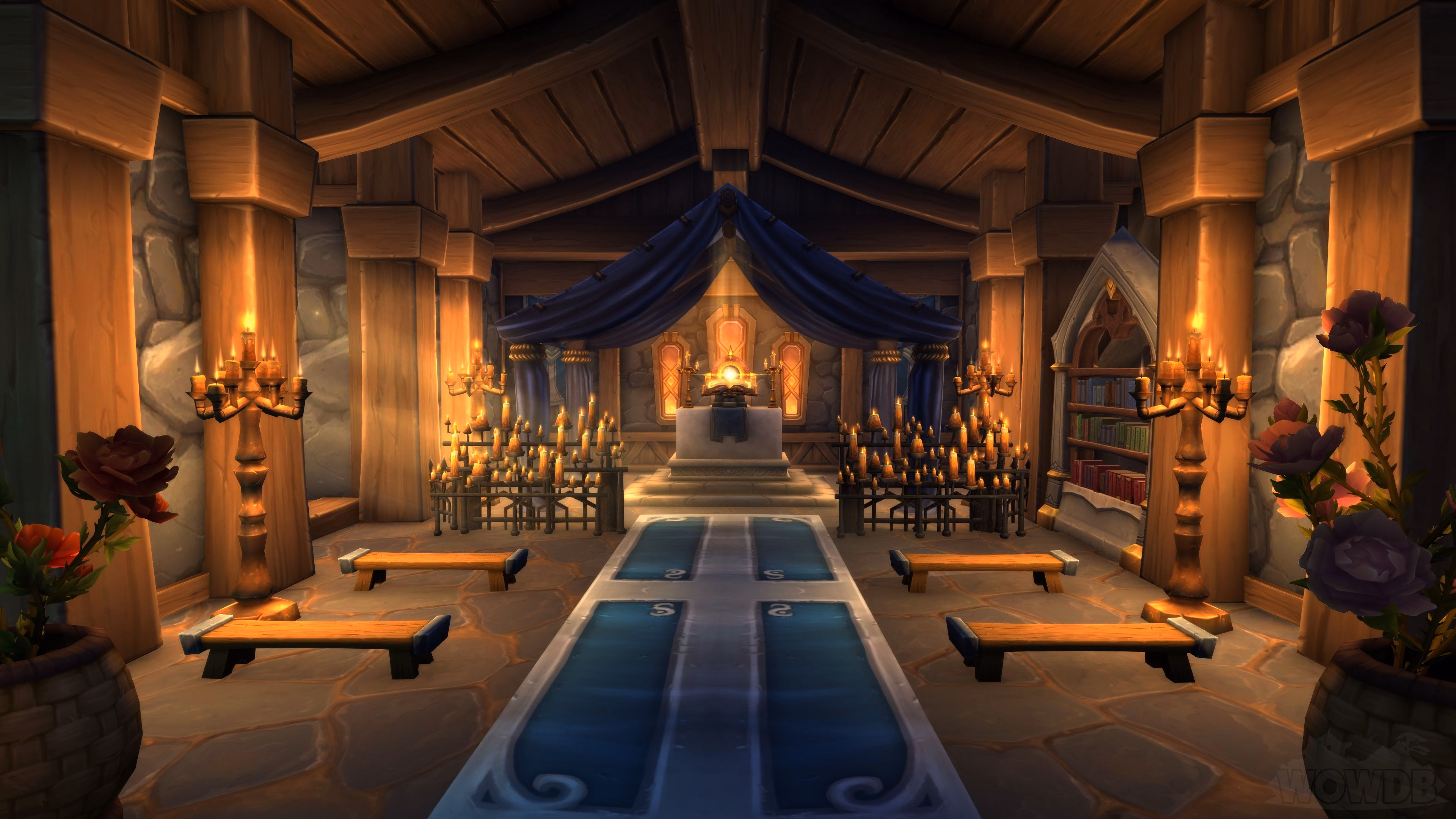 The interior adopts a gigantic architecture adorned with the memories of the paladin who has faced the dangers of Azeroth for fifteen years. The ground floor includes the reception rooms: hall with memorial, large living room, bar, dining room, library, chapel and winter garden. The staircase opens onto the cellar. Upstairs, the private area, the workshop and the bedroom. The adjoining bathroom is currently being designed: it will be a rocky hot spring. The upper floor has numerous balconies allowing the paladin to follow the various events and discussions on the ground floor in complete discretion.
