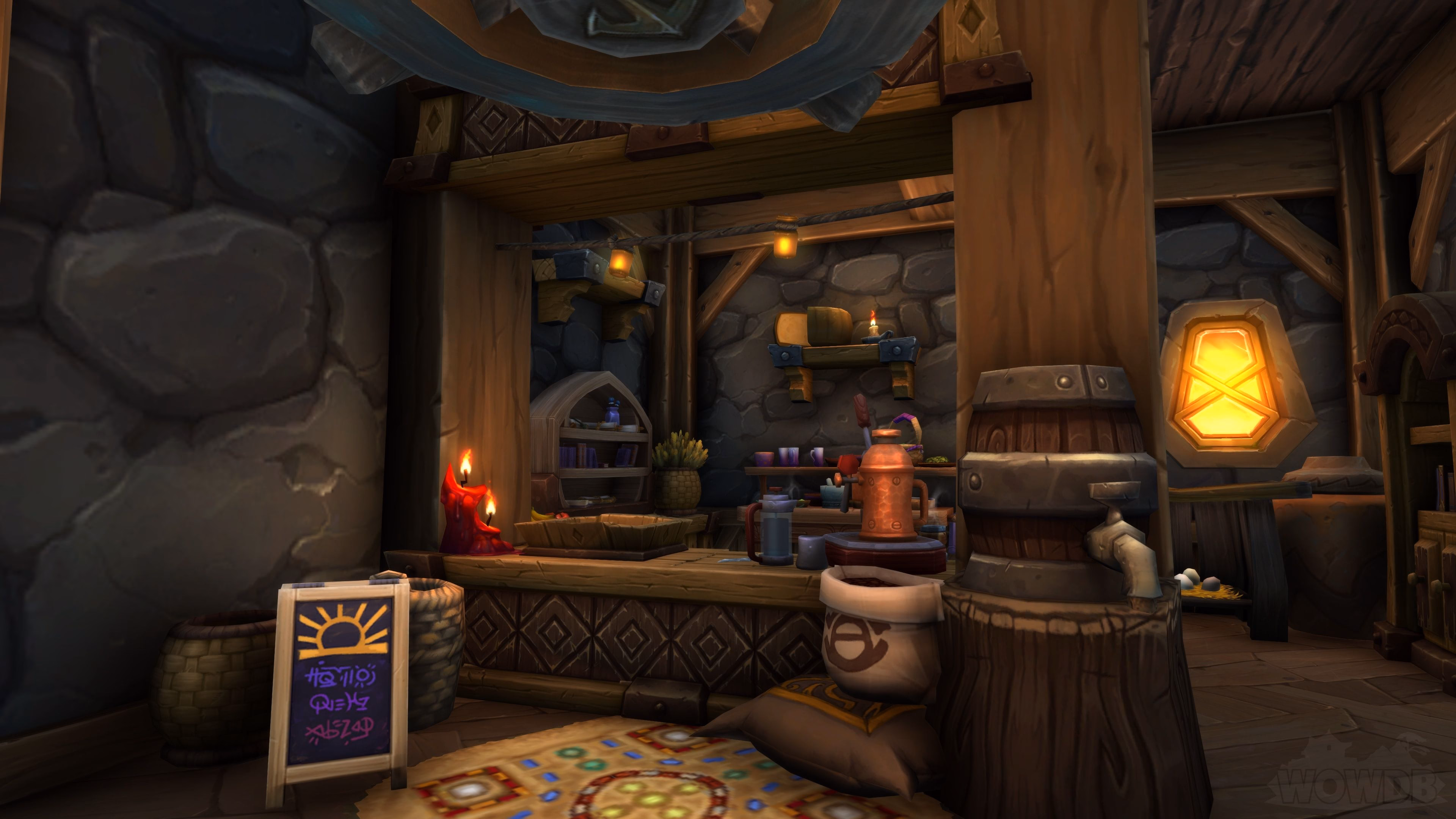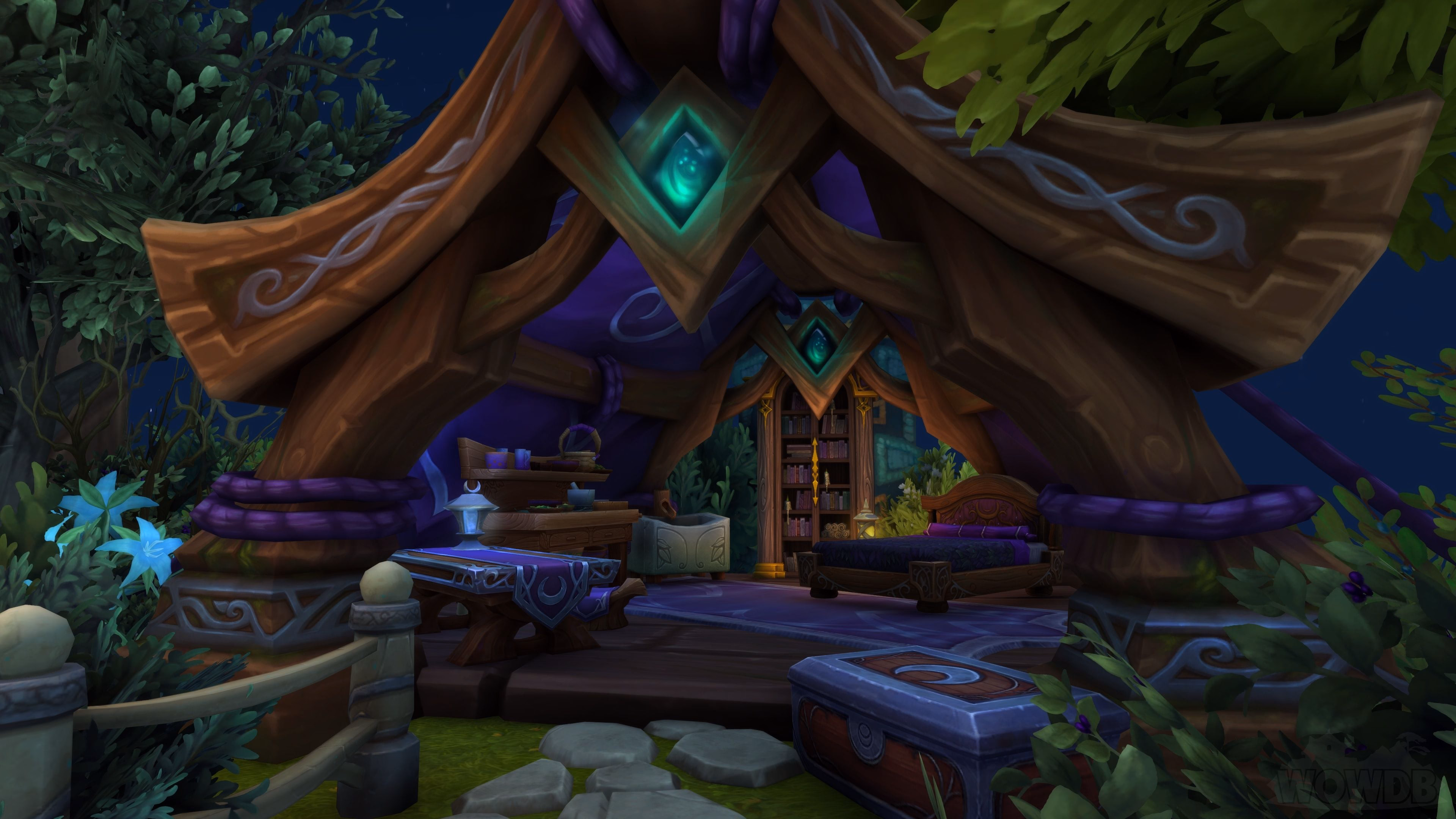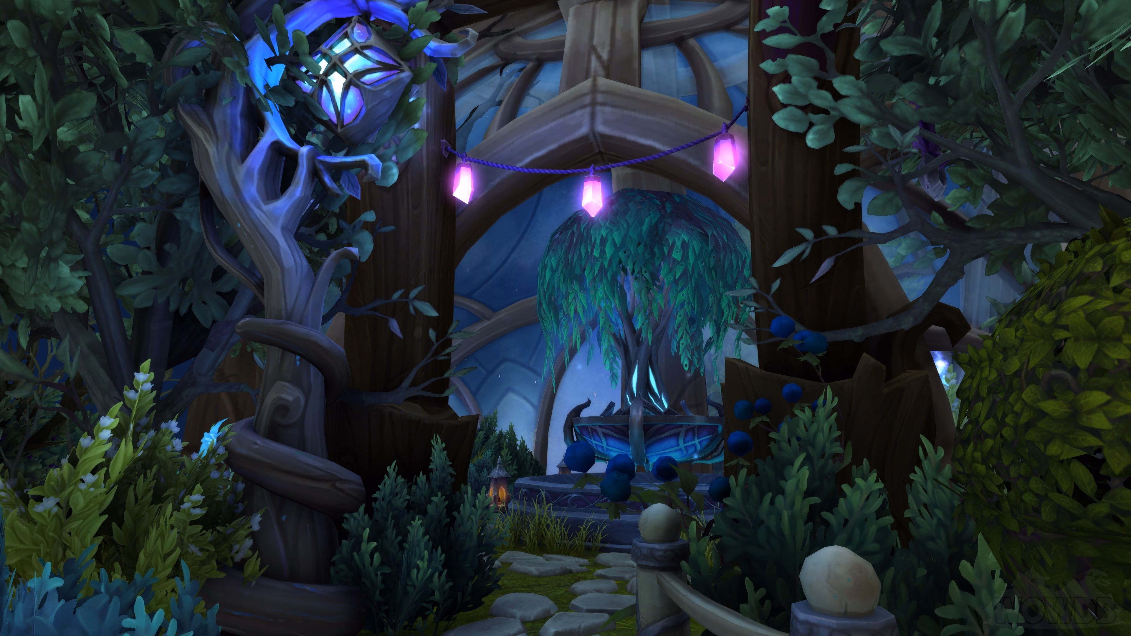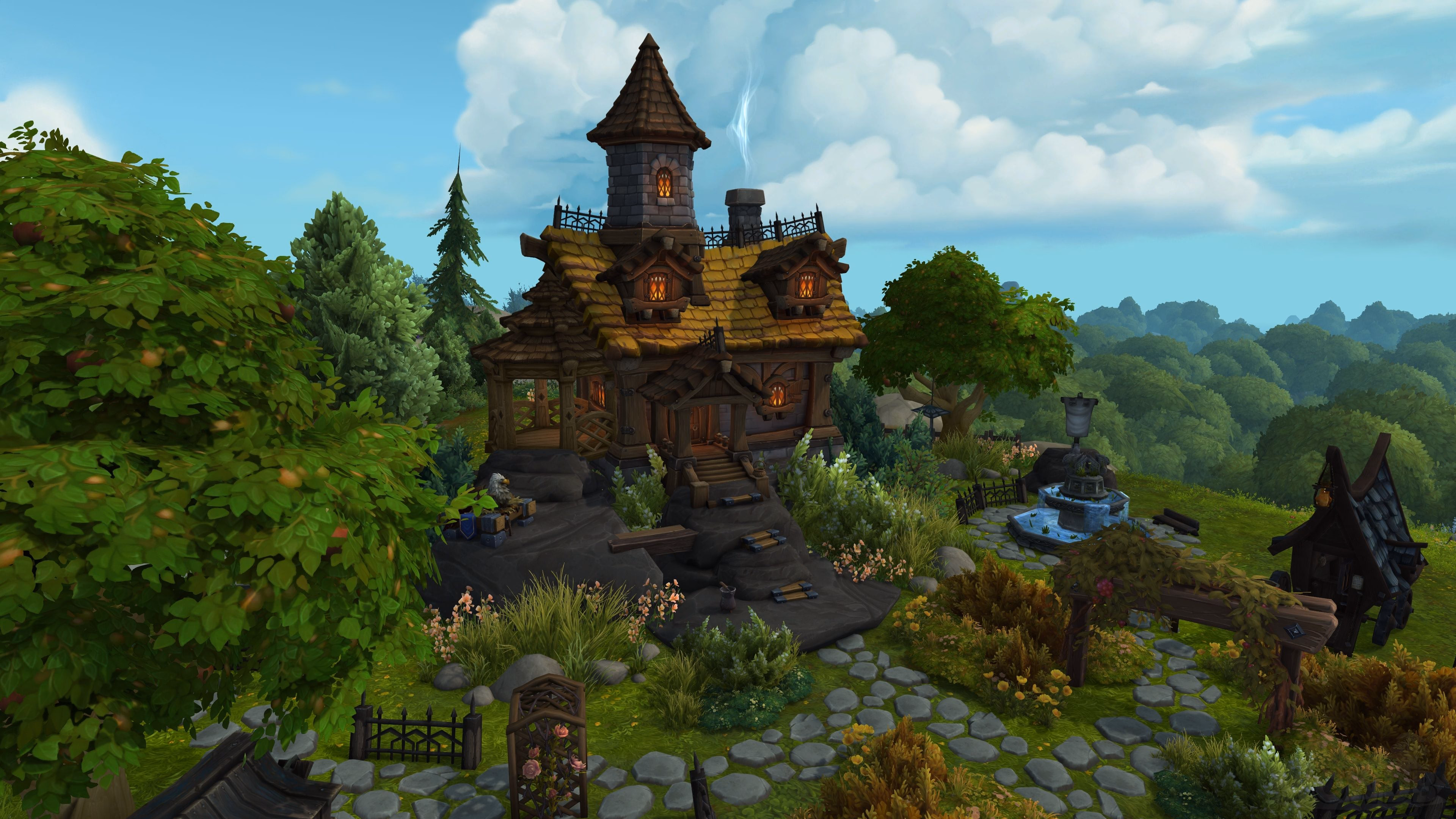 The interior adopts a gigantic architecture adorned with the memories of the paladin who has faced the dangers of Azeroth for fifteen years. The ground floor includes the reception rooms: hall with memorial, large living room, bar, dining room, library, chapel and winter garden. The staircase opens onto the cellar. Upstairs, the private area, the workshop and the bedroom. The adjoining bathroom is currently being designed: it will be a rocky hot spring. The upper floor has numerous balconies allowing the paladin to follow the various events and discussions on the ground floor in complete discretion.